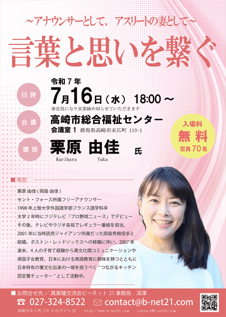 今年の講師に相応しい方です。大谷選手がメジャーで大活躍されてますが、ご主人の岡島秀樹さんは、レッド・ソックス時代優勝し貢献活躍され、今年、群馬「ダイヤモンドペガサス」のコーチに就任されご縁がつながっています。