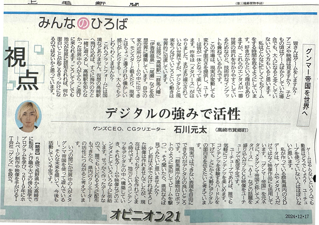 5月例会を下記要領で開催します。 【開催日時】5月21日(水)午後6時から【会 場】高崎市総合福祉センター会議室【内 容】株式会社ゲンズ 石川元太社長講演 テーマ「グンマ―帝国を世界へ」 株式会社ゲンズは、3DCGからVR・AR・メタバー… -
