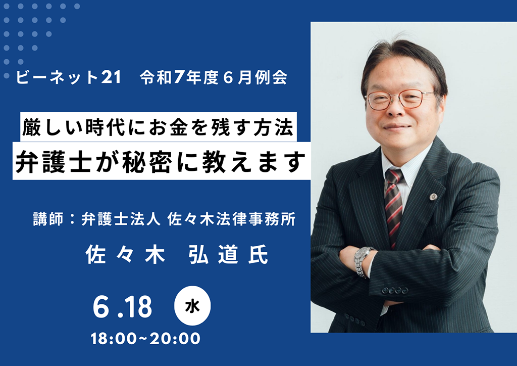 風薫る5月、皆さまいかがお過ごしでしょうか?さて、6月例会は誰もが関心を持つ「お金の話」をお届けします! ━━━━━━━━━━━━━━━━━━━━━━━■6月例会テーマ「厳しい時代にお金を残す方法」〜弁護士が秘密に教えます〜━━━━━━━━━━━━━━━━━━━━━━━ 物価高騰、年金制… -