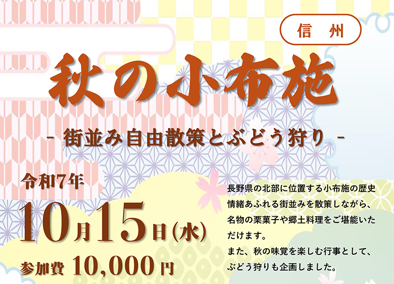 10月例会「視察旅行」のご案内です。 【企画内容】秋の小布施 ~街並み自由散策とぶどう狩り~ ■実施日:10月15日(水)■集 合:新前橋駅東口(7:40発)、高崎駅西口(8:20発)■訪問先(予定)①小布施 街並み散策栗の小径をはじめ、歴史情緒ある蔵造… -