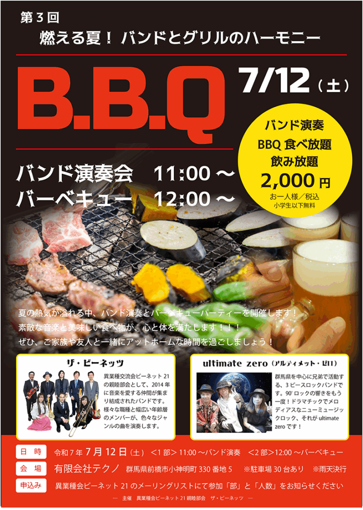 さて、今年も親睦部会ザ・ビーネッツ主催の食と音楽の祭典、「燃える夏!バンドとグリルのハーモニー」を開催いたします。