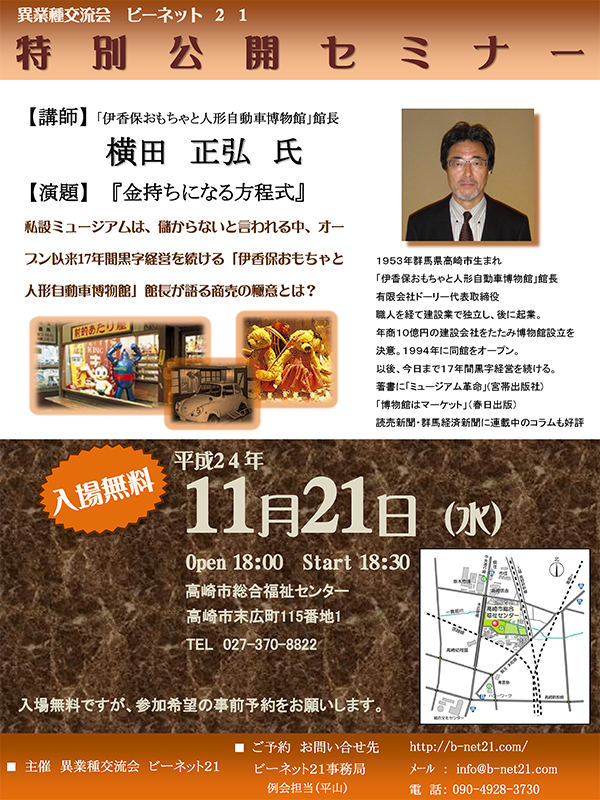 1953年群馬県高崎市生。博物館、美術館は儲からないと言われる中で、年間40万人を超す来館者を集め、うち3割はリピーターという。なぜ、お客様をそんなに魅了するのか、横田館長の熱い思いとお客に対する姿勢、そして経営者としての緻密な経営戦略を、今回の講演にて明らにしていただきました。