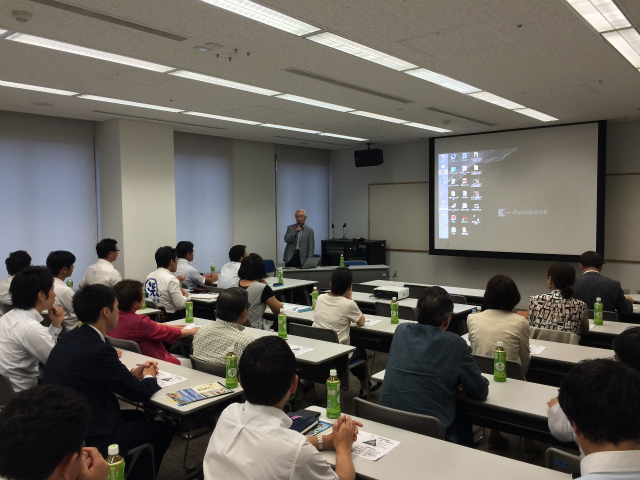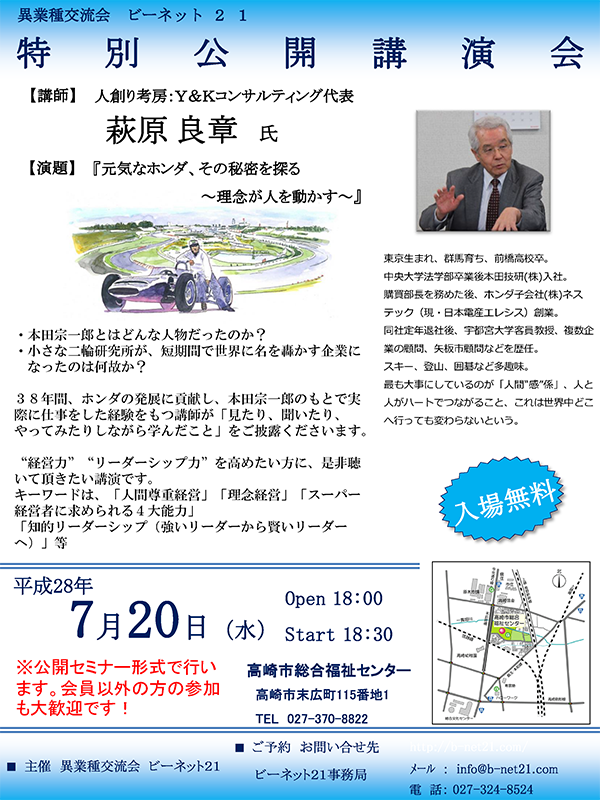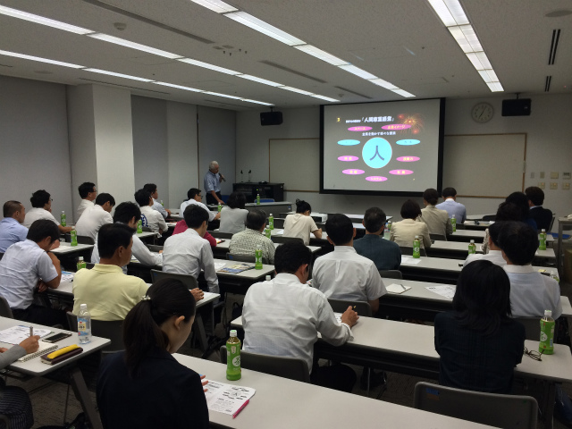 7月例会は公開講演のため、会員以外の方を含め約40名に参加いただきまして、熱気と活気ある、たいへん勉強になる講演会となりました。今回の講師の荻原先生は38年間、ホンダの発展に貢献し、本田宗一郎のもとで実 際に仕事をした経験をもち「見たり、聞いたり、 やってみたりしながら学んだこと」をビデオをまじへご披露くださいました。