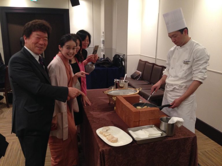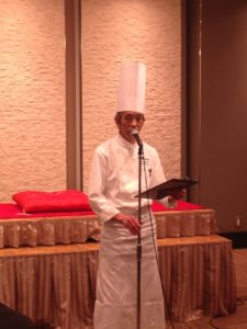 懇親会ではホテル総料理長の板橋様より本日の料理の説明をしていただき、フォアグラ丼を直接会場内で調理していただきました。