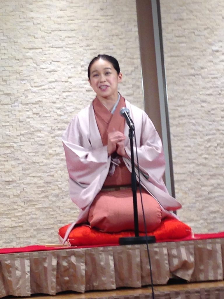 ふだん直接聞いたり見たりすることのできない落語を手振りなどの体を使ったり、扇子を使っての表現をまじえて見させていただき会場は笑いと拍手に包まれました。