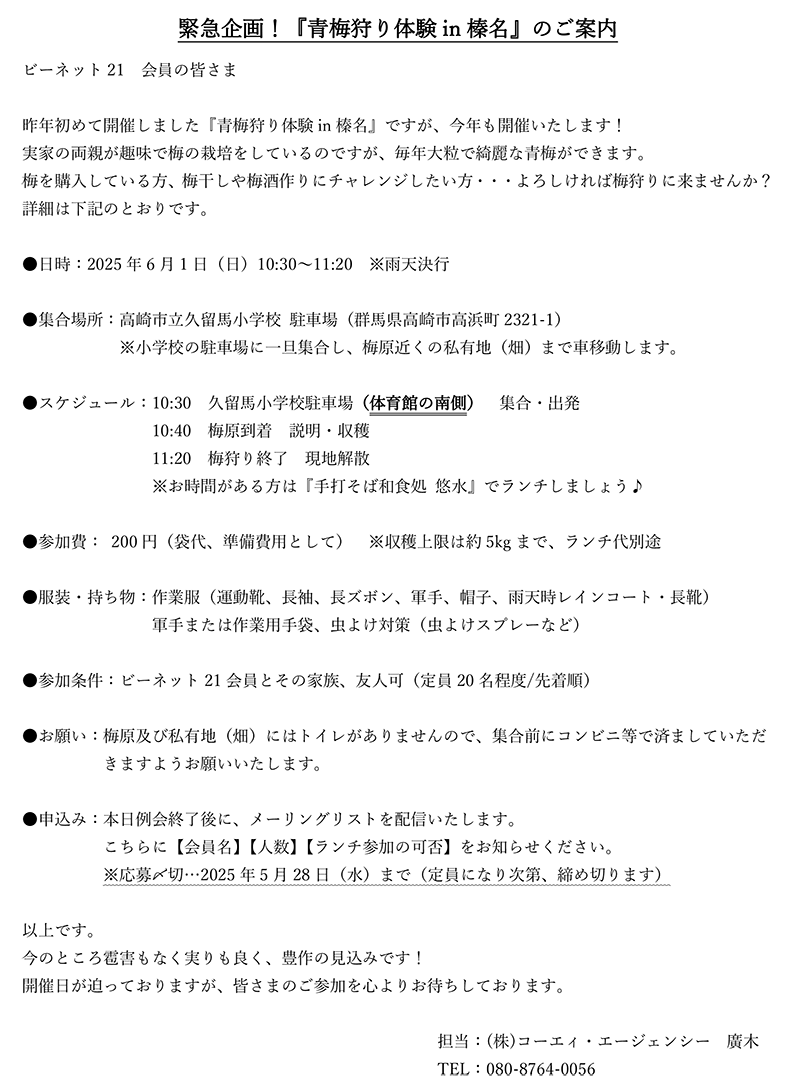 昨日の例会でも発表しましたが『青梅狩り体験in榛名』のお知らせです!