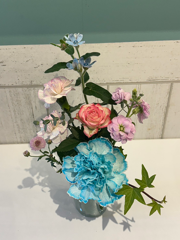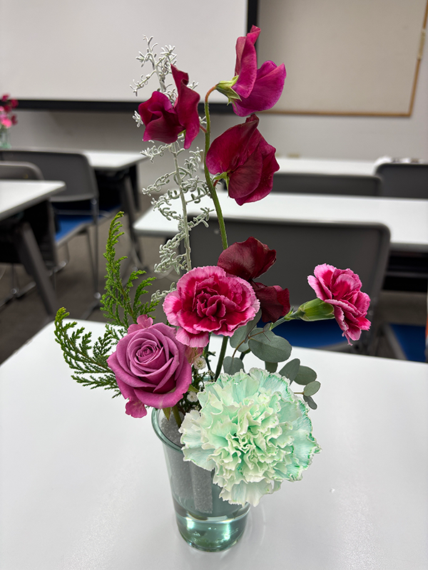 2部では、生花と草花を使って各自が生け花体験をしました。外所さんが各テーブルを廻ってアドバイスをして下さいました。私は、自宅に持ち帰り玄関に飾りました。