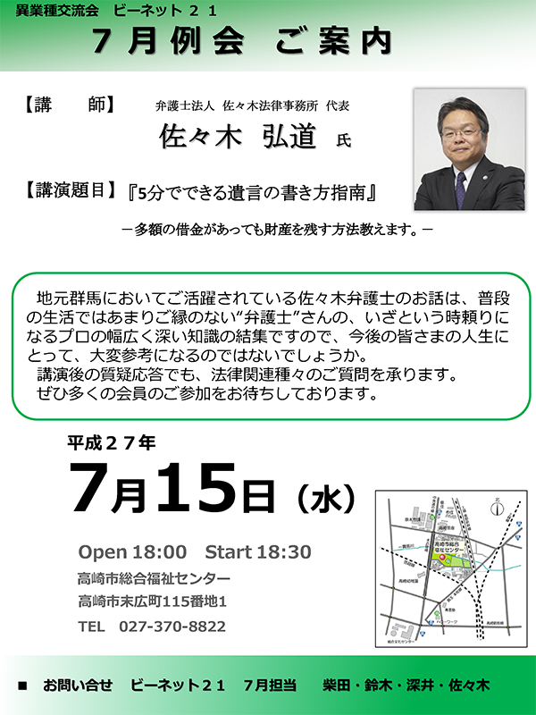 【日時】平成27年7月15日(水)開場18:00~ 講演18:30~【場所】高崎市総合福祉センター【演題】『 5分でできる遺言の書き方指南 』 -多額の借金があっても財産を残す方法教えます-【講師】弁護士法人 佐々木法律事務所 代表 佐々木 弘道 氏... -