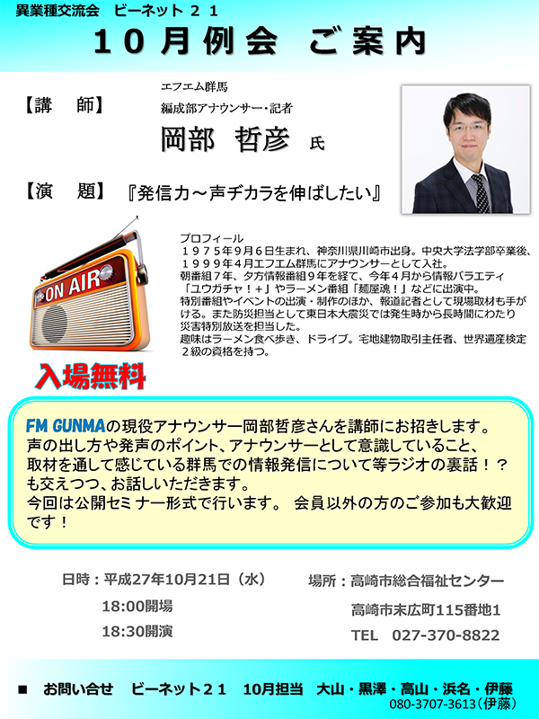【日時】平成27年10月21日(水)18:00~【場所】高崎市総合福祉センター/高崎市末広町115番地1【演題】『発信力~声ヂカラを伸ばしたい』【講師】FM群馬 編成部アナウンサー・記者 岡部 哲彦 氏 【講演内容】10月例会はFM群馬、現役アナウンサーの岡部哲彦さ... -