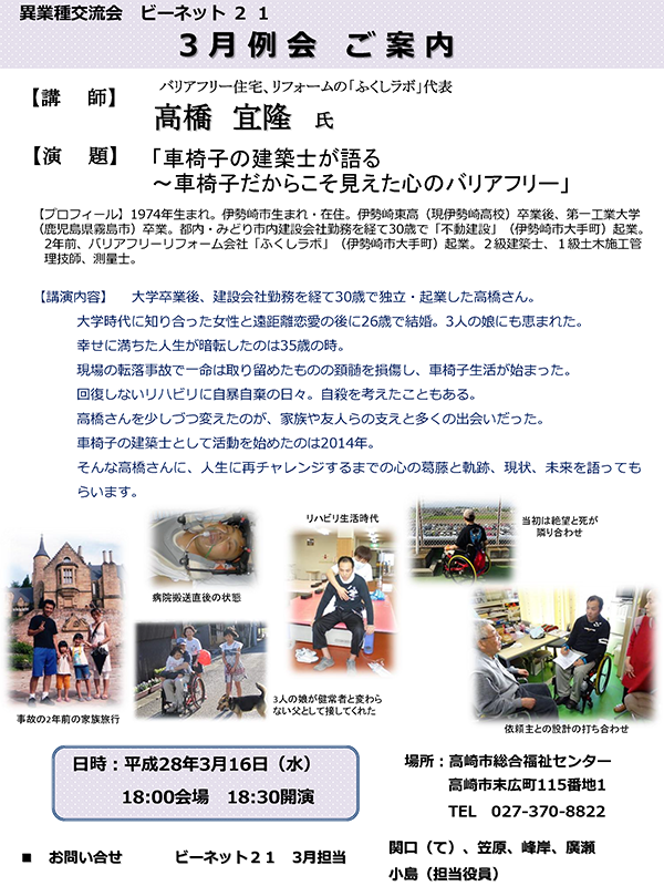 【日時】平成28年3月16日(水)18:00~【場所】高崎市総合福祉センター/高崎市末広町115番地1【演題】「車椅子の建築士が語る~車椅子だからこそ見えた心のバリアフリー」【講師】バリアフリー、リフォーム「ふくしラボ」 高橋 宣隆 代表 ◎ ふくしラ... -