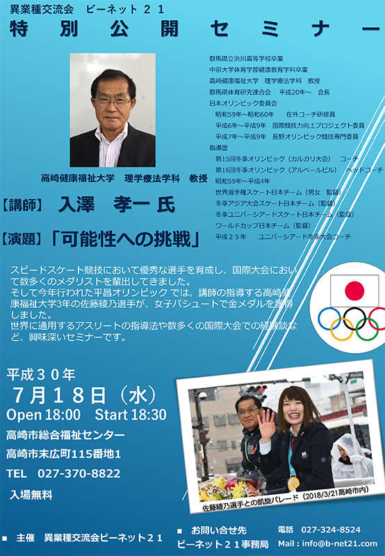 【日時】2018年7月18日(水)18:00~【場所】高崎市総合福祉センター/高崎市末広町115番地1 TEL 027-370-8822【内容】 公 開 セ ミ ナ ー【演題】『可能性への挑戦』【講師】入澤 孝一 氏/高崎健康福祉大学 理学療法学科 教授 【講演内容】入澤教授... -