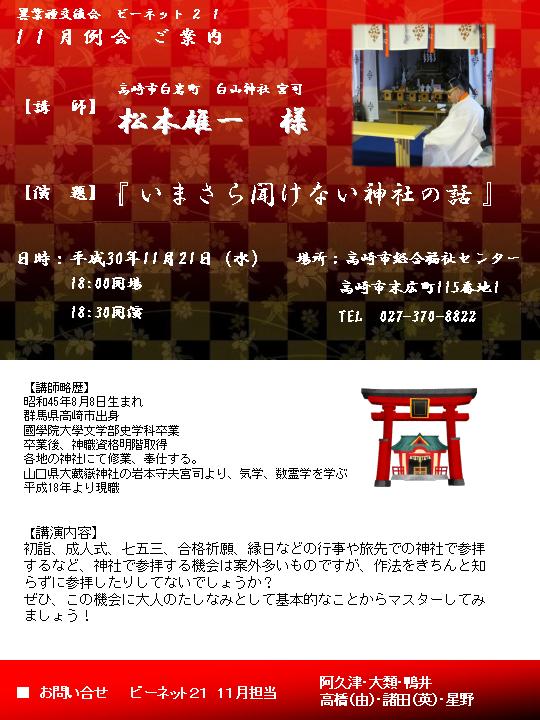 【日時】2018年11月21日(水)18:00~【場所】高崎市総合福祉センター 高崎市末広町115番地1 TEL 027-370-8822【内容】『 いまさら聞けない神社の話 』【講師】高崎市白岩町 白山神社 宮司 松本雄一 様 ■講師プロフィール 昭和45年8月8日生まれ群馬県... -